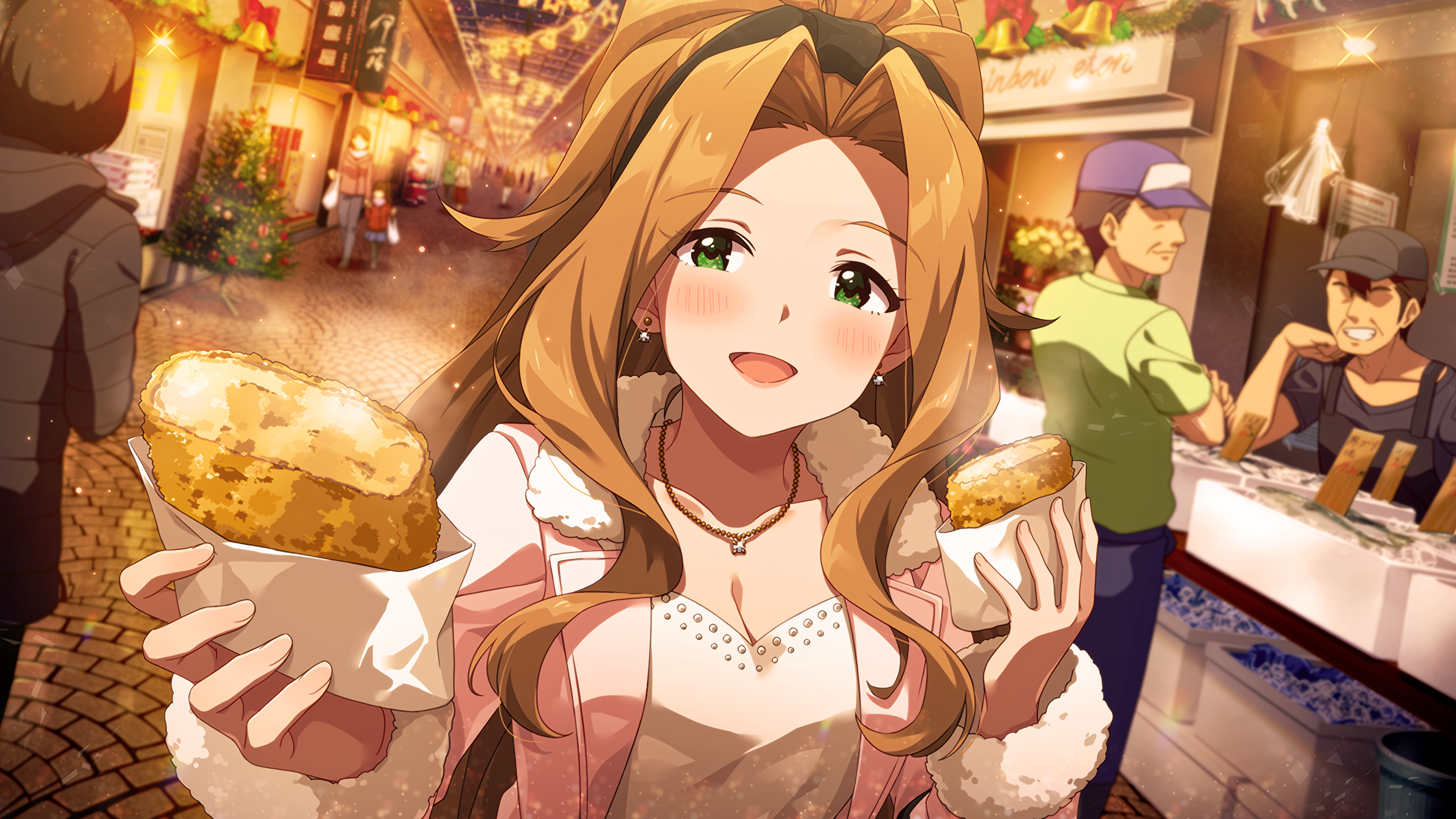 フレーバーテキスト はい、(プロデューサー名)。冷めないうちに、半分どうぞ。この商店街で一番の絶品でしてよ! ……ふふ♪なんだか不思議な気分ですわ……。あなたとこうして、ここにいることが。