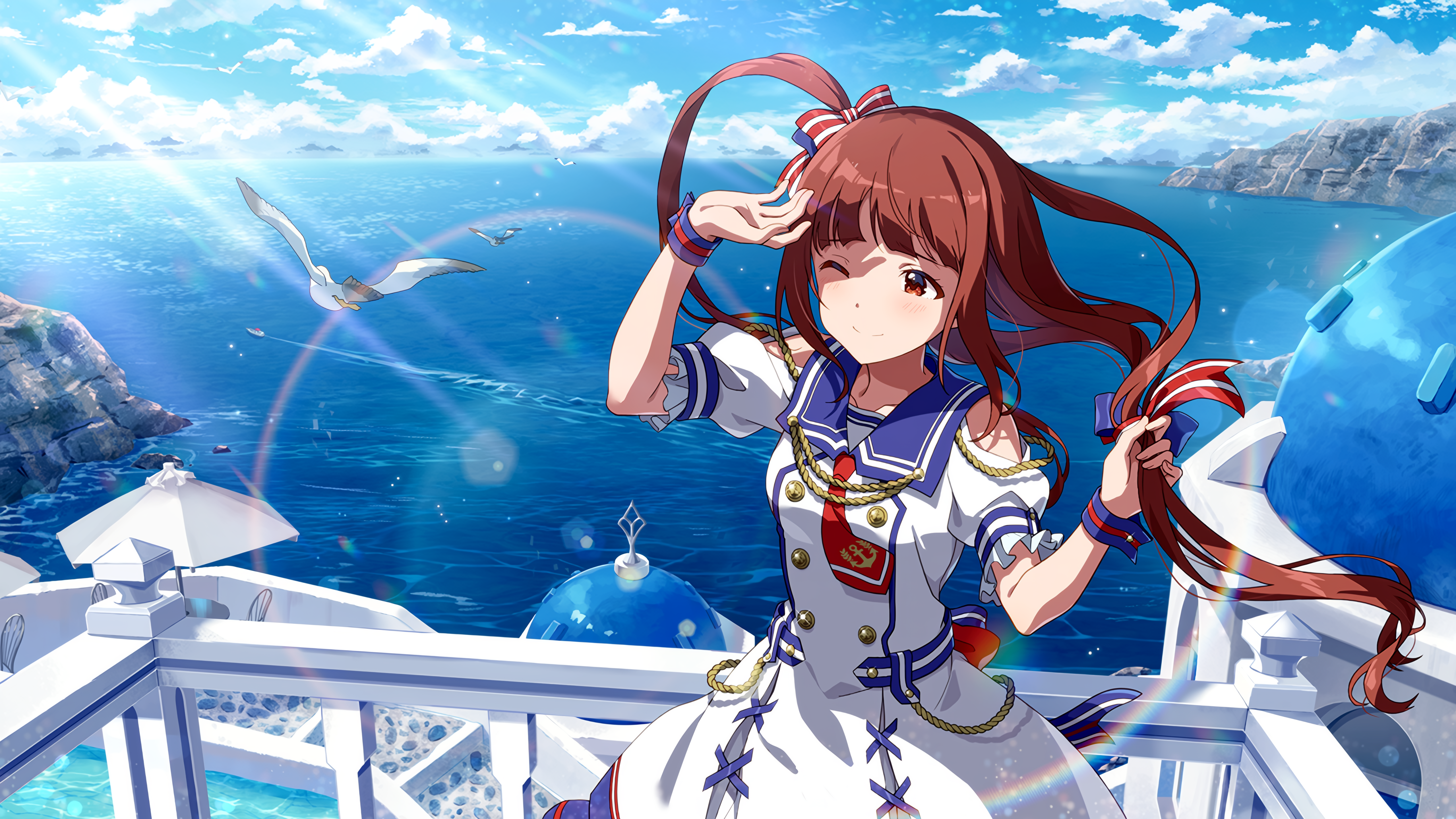 フレーバーテキスト なんて綺麗な海……爽やかな風に吹かれていると、時間を忘れちゃいそうです。(プロデューサー名)さん、ありがとうございます! ありさを、こんな素敵な場所に連れてきてくれて……。
