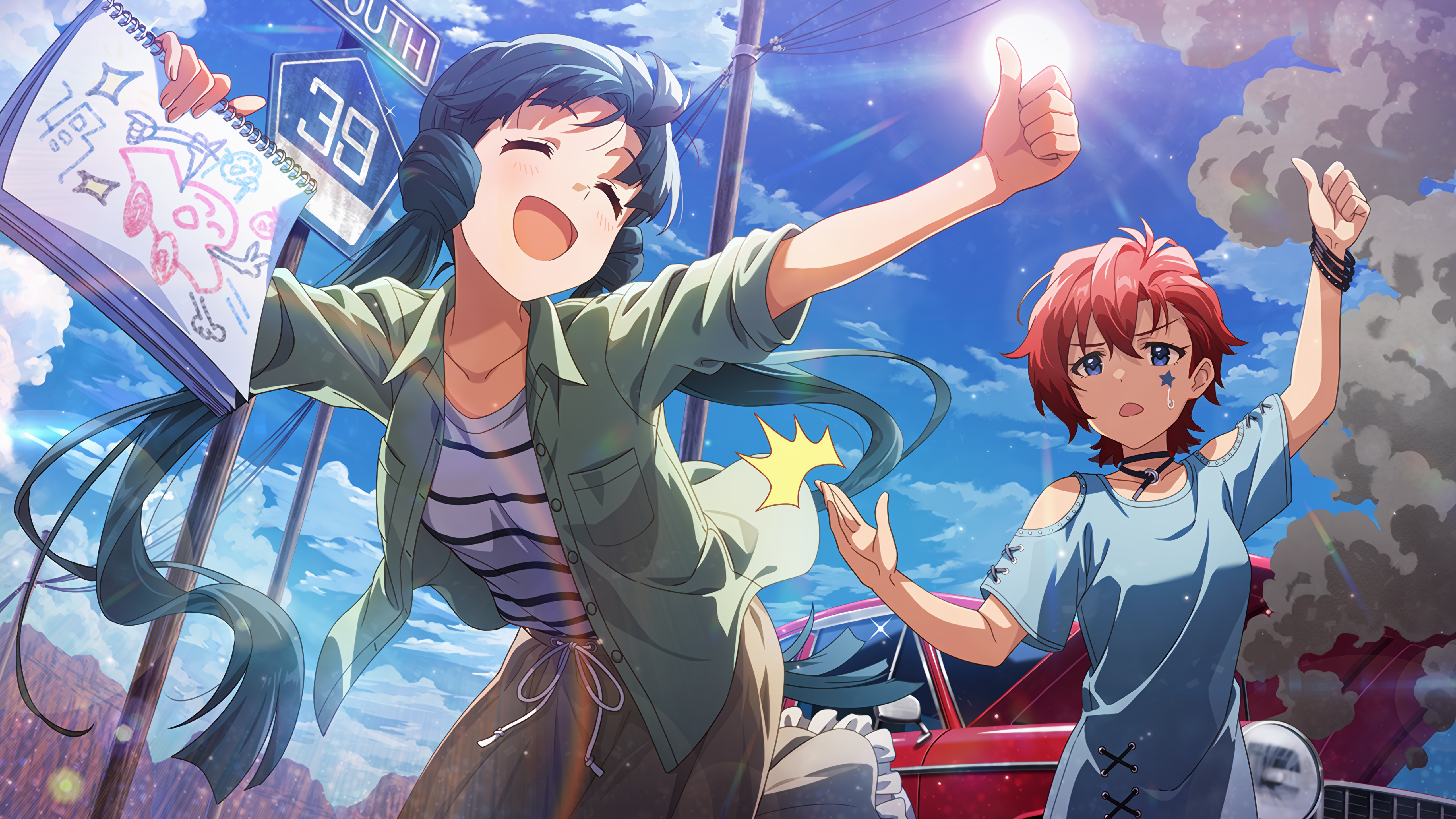フレーバーテキスト 見て見て、ジュリアちゃん!すっごく上手に描けちゃった♪これなら車も停まってくれると思うな~。ほらほらジュリアちゃん、ダンスダンス!へーい、タクシー♪