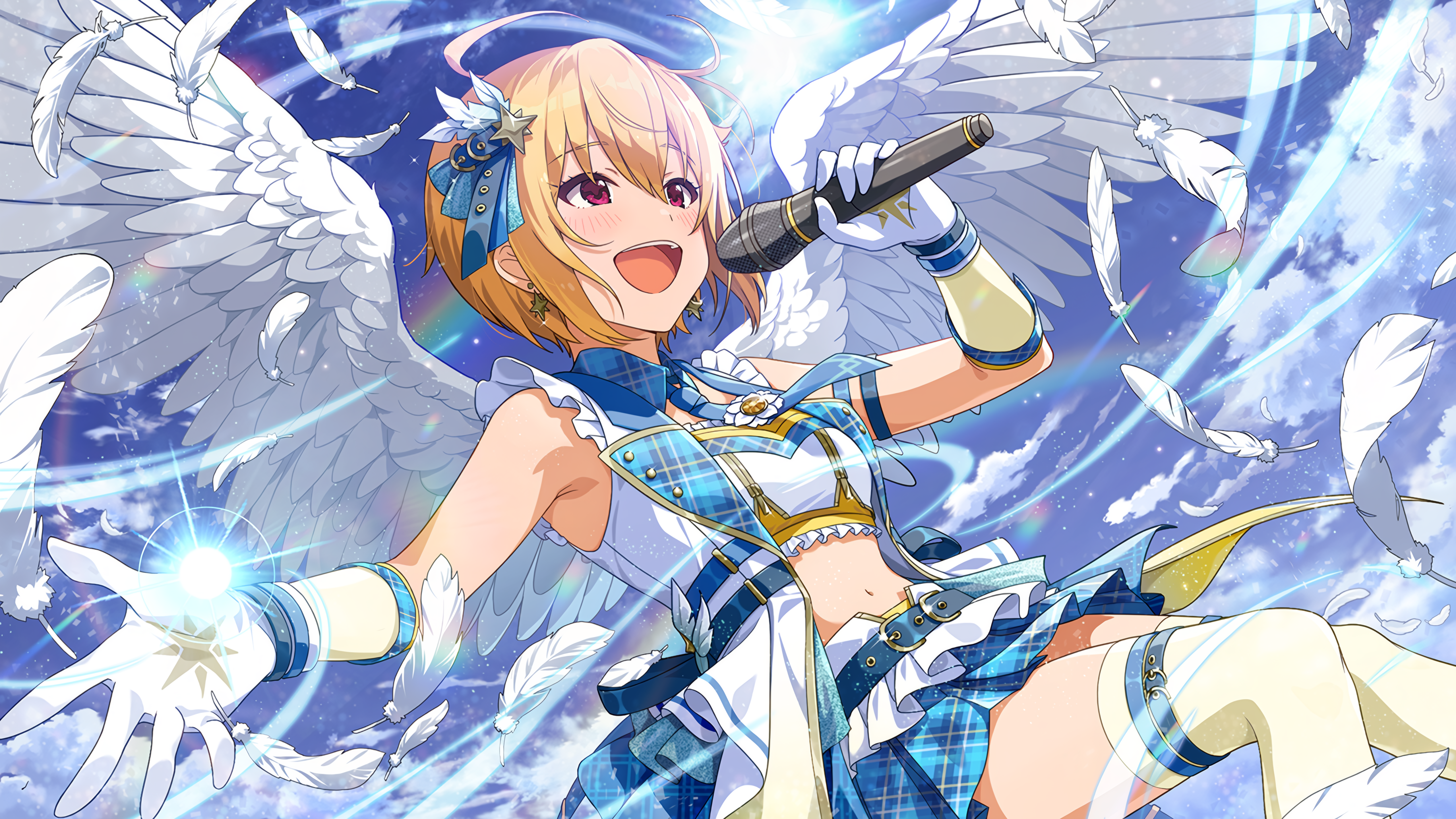 フレーバーテキスト みんな、とってもキラキラしてたから、わたしも頑張ってみようって決めたの。もっと高く、大きな空を飛んでみたい。(プロデューサー名)さんと一緒だから、絶対大丈夫! ……ですよね♪