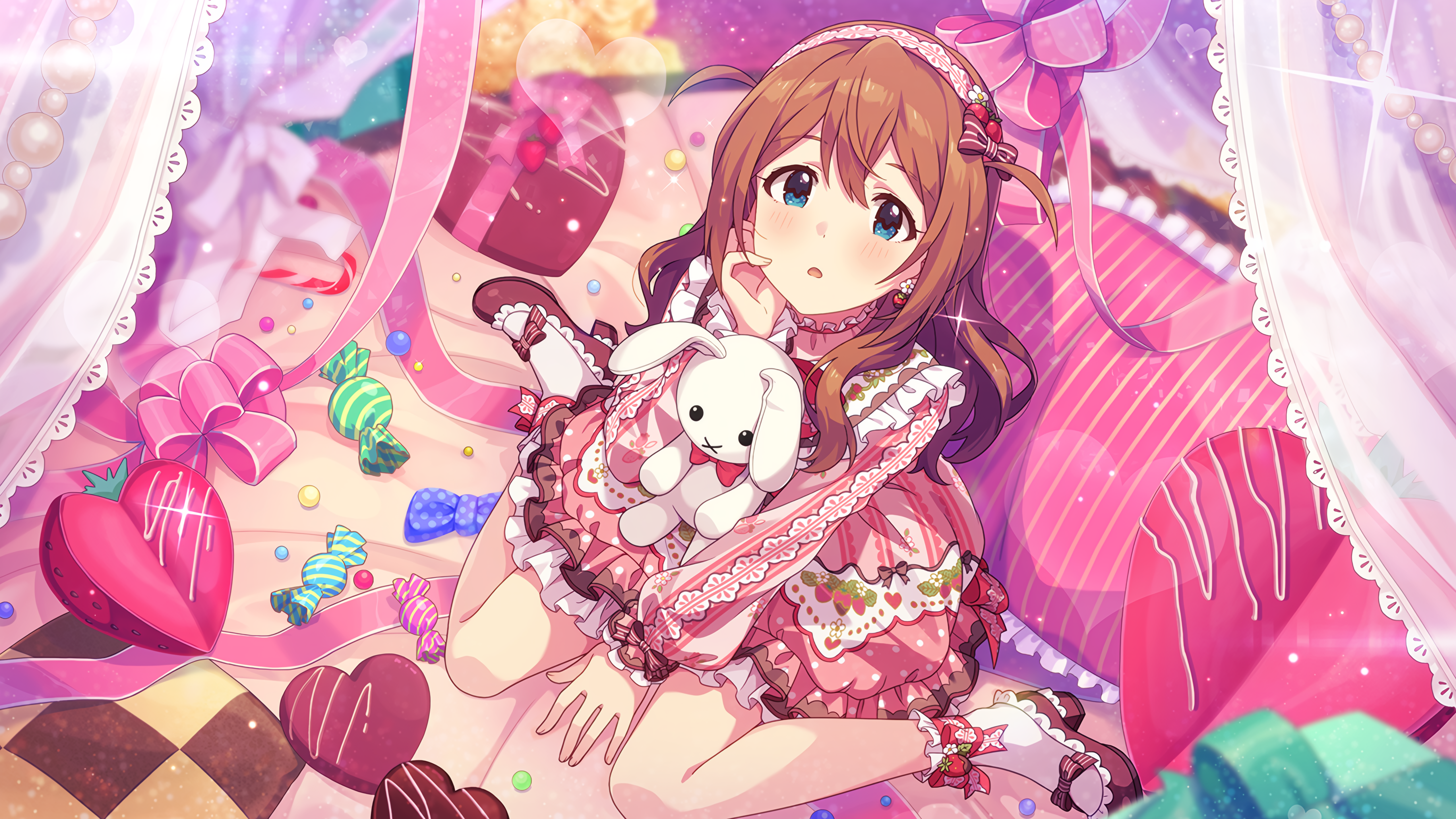 フレーバーテキスト ねえ、(プロデューサー名)!この衣装、ちょっと子どもっぽすぎないかしら? いくらチョコレートを配るって言っても……。えっ、似合う? そ、そう……ぐぬぬ。