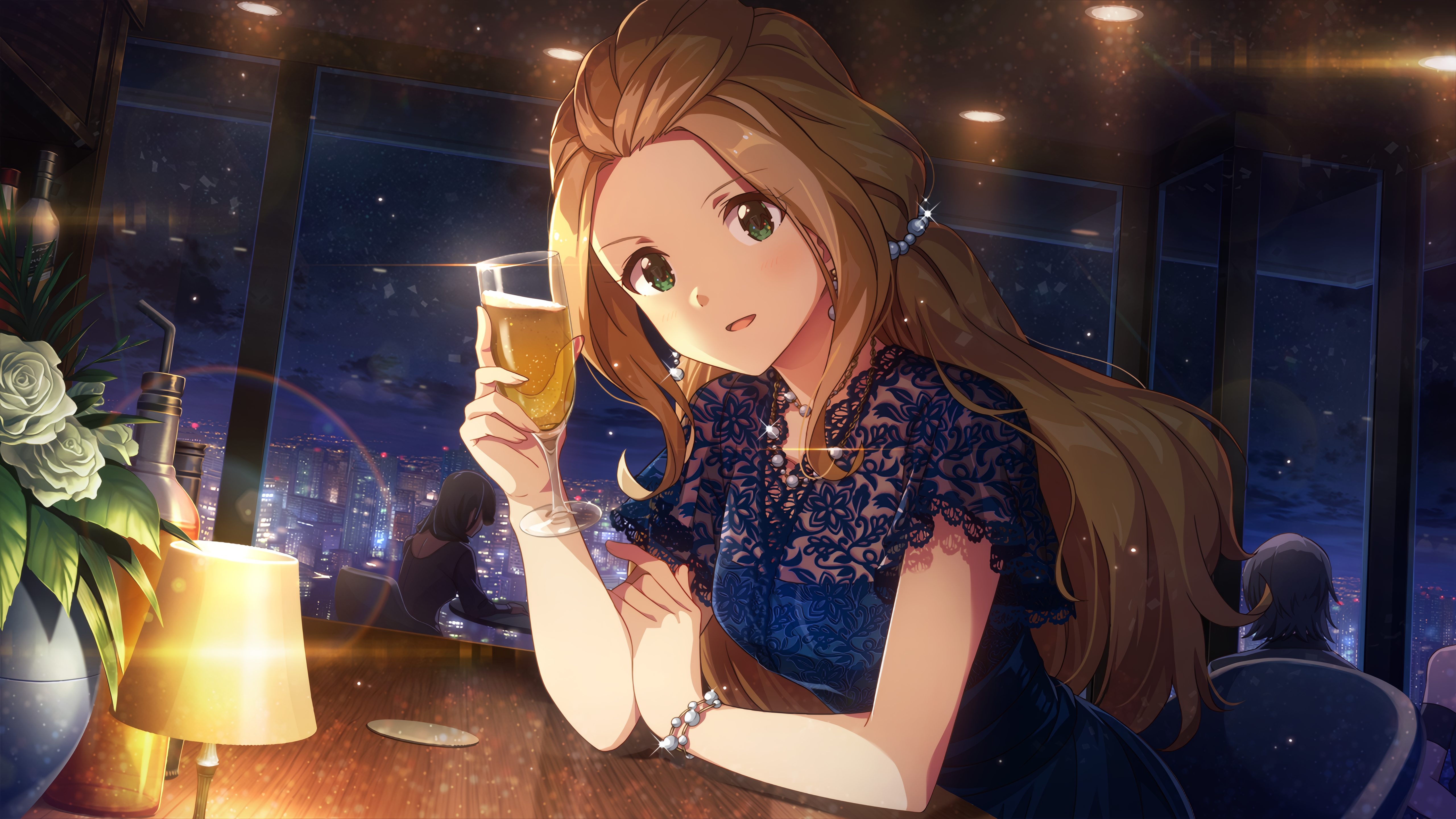 フレーバーテキスト お疲れさまです、(プロデューサー名)。忙しいはずなのに……お付き合いいただいて、感謝いたしますわ。とりあえず、乾杯しませんか?今日もお仕事、ご苦労様でした……ふふっ♪
