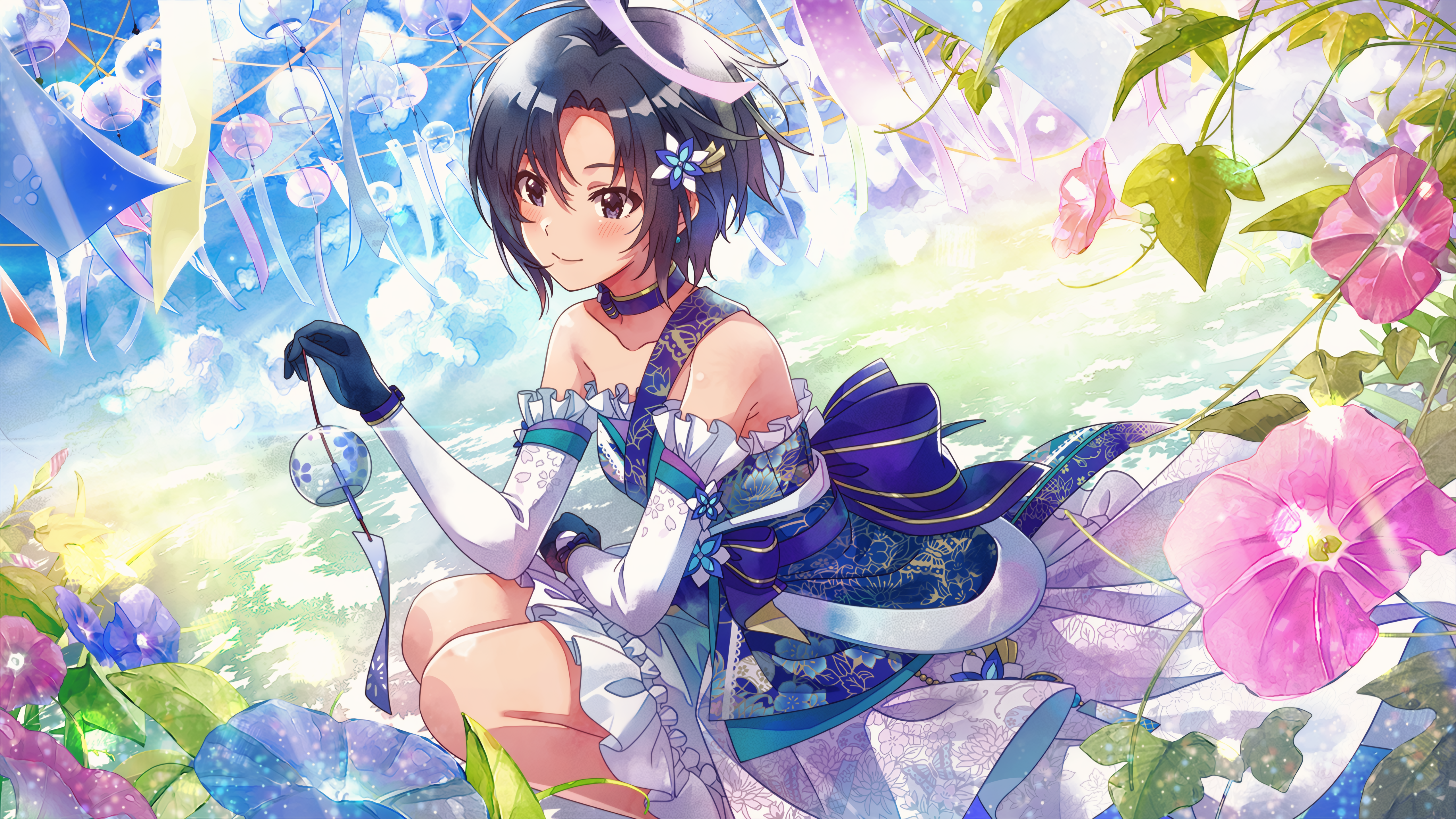 フレーバーテキスト お祭り、いろんな屋台が出てるなぁ。あ、風鈴も! キレイなのがたくさん……どれがいいかな……。みんなはどう?よし、ボクはもう(プロデューサー名)に買ってあげるの、決めたもんね。へへっ。