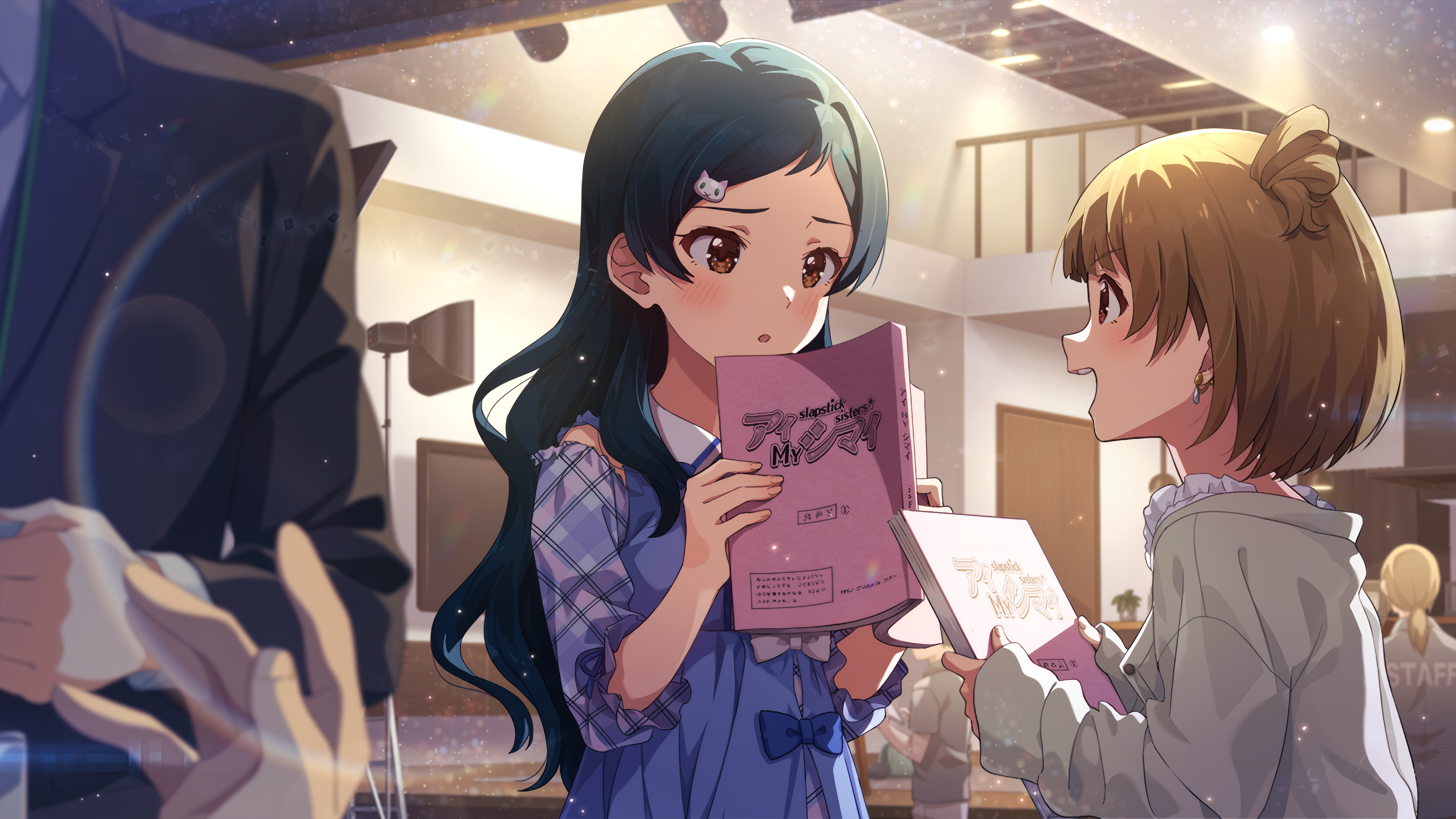 フレーバーテキスト 「お、お姉ちゃんと一緒じゃなきゃイヤ!」ふぅ。もうすぐ次のシーンだけど……。(プロデューサー名)さん達も見てるし、ちゃんと言えるかな。……どうしたの、育?えっ……うん、応援ありがとう。頑張るね。