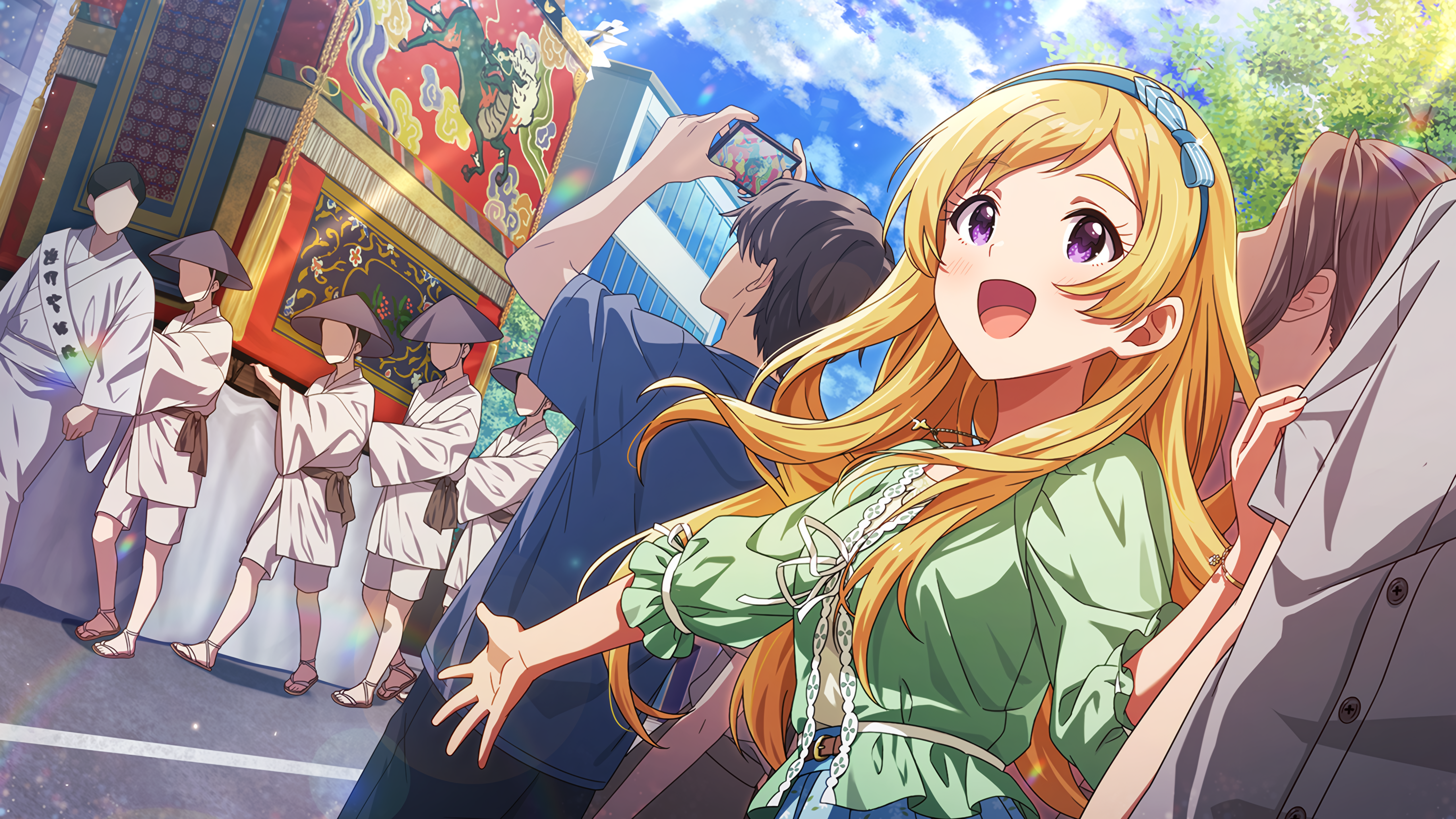 フレーバーテキスト わぁ、これが祇園祭……!こうして近くで見ると、すごい迫力ですね!昔の人々も、私たちと同じような熱気を感じていたのでしょうか。息の合った掛け声笛の音……とっても素晴らしいです♪