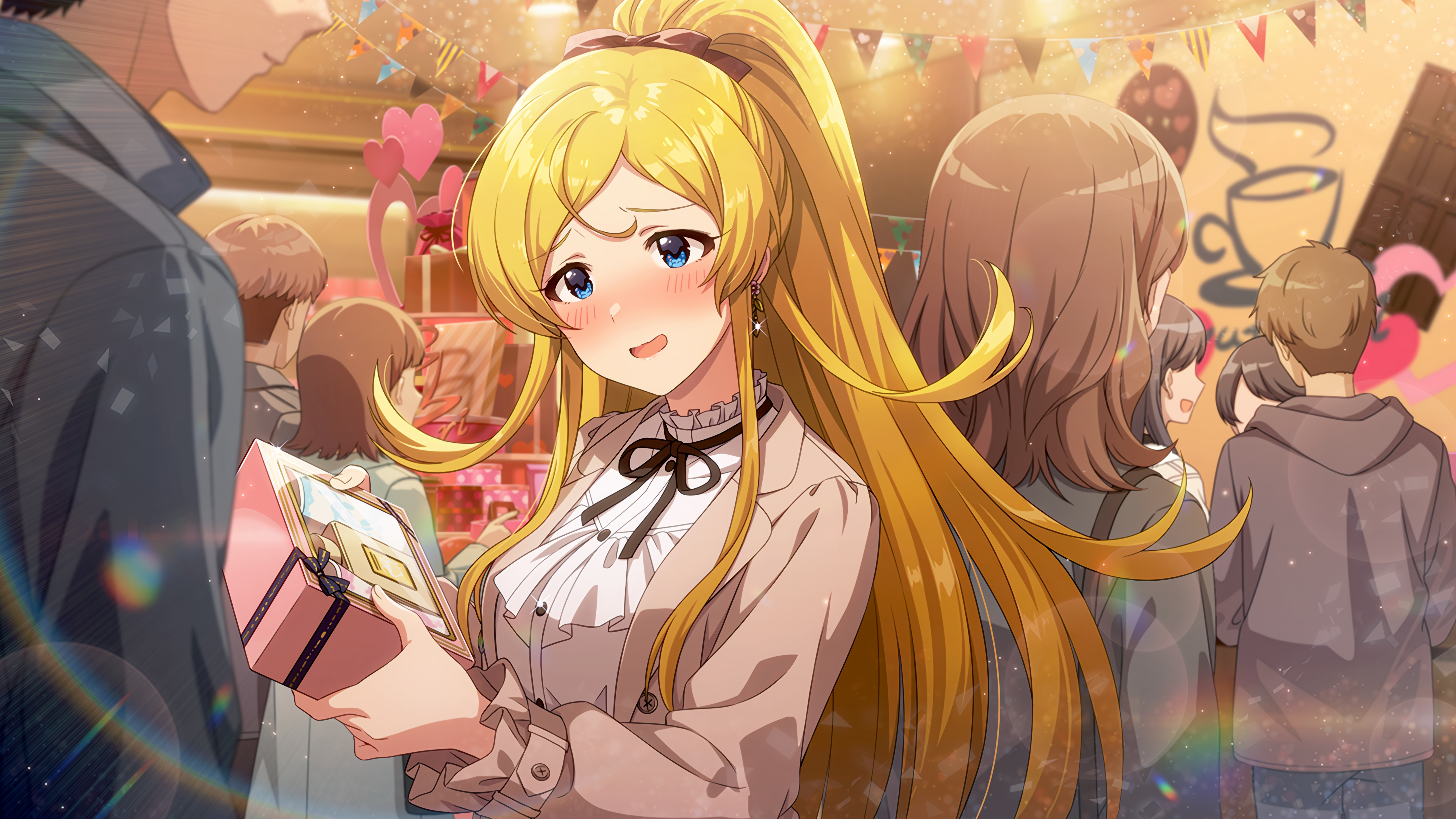フレーバーテキスト 今日は……あ、ありがとうございました。あの、これ受け取ってもらえますか……?(プロデューサー名)さんのために、頑張って、作ってきたんです……。お、お口に合うといいんですけど……。