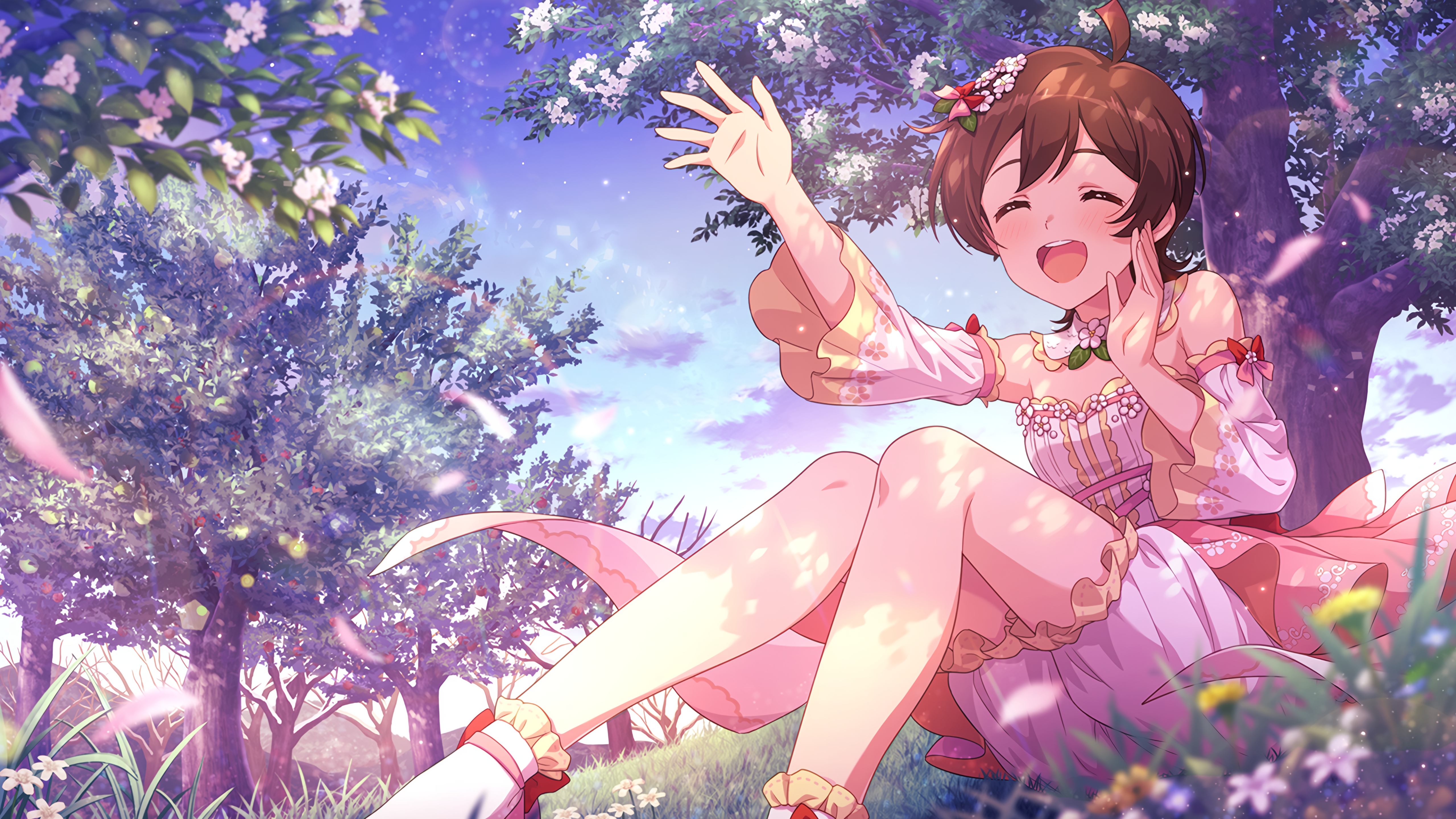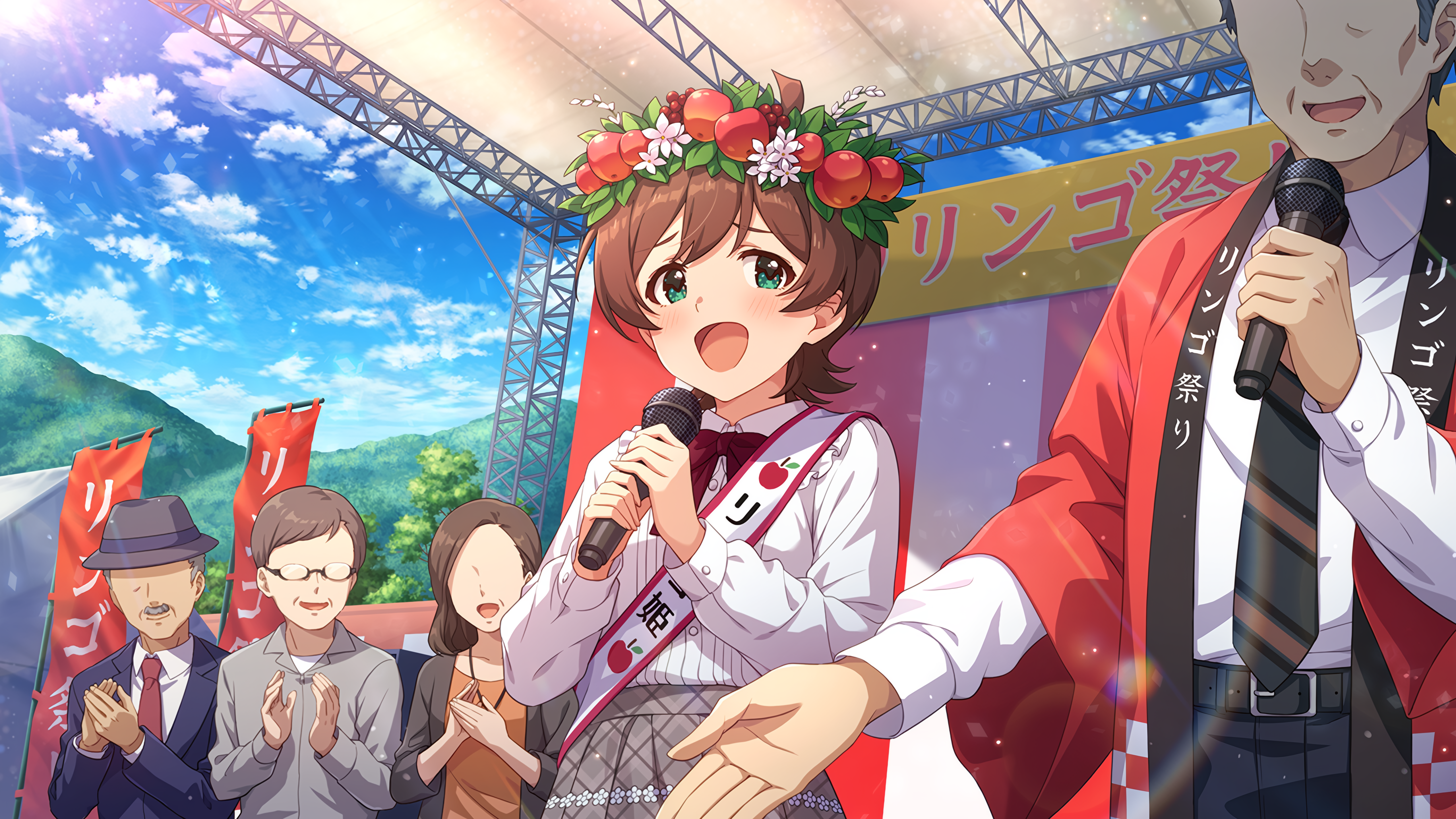フレーバーテキスト あたしがリンゴ姫だなんて……えへへ。ちょっこし恥ずかしいけど、嬉しいべさ!小さい頃から歌が好きだったから、夢みたいだよぉ……みんな、あたしのことを選んでくれて、本当にありがとねぇ。