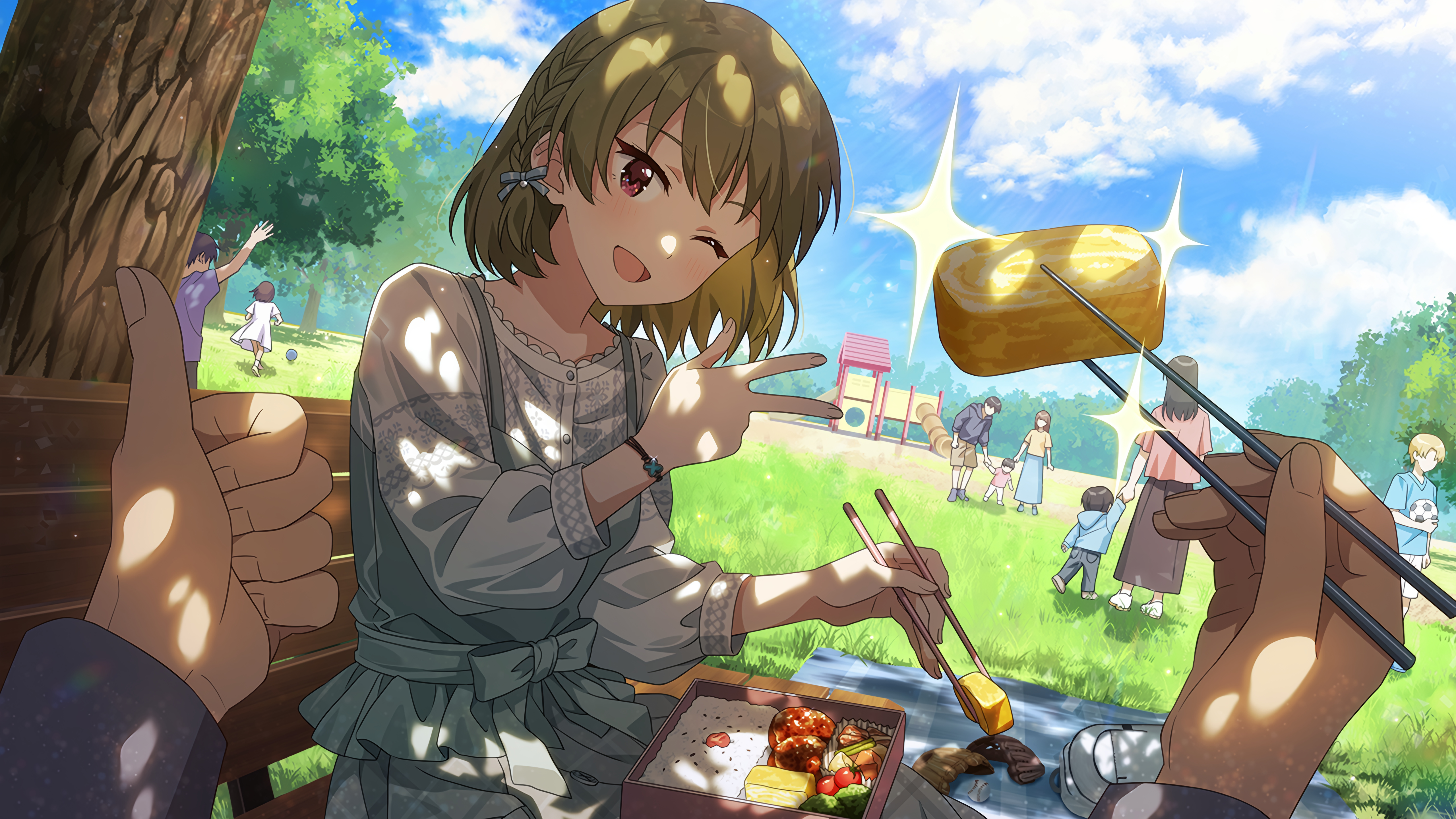 フレーバーテキスト 思いっきりキャッチボールできたし、弁当もうまいって言ってくれたし……。すげー楽しかったから、また遊びたいなぁ。あれ? あっちのホームにいるの、(プロデューサー名)だ! えへへっ。