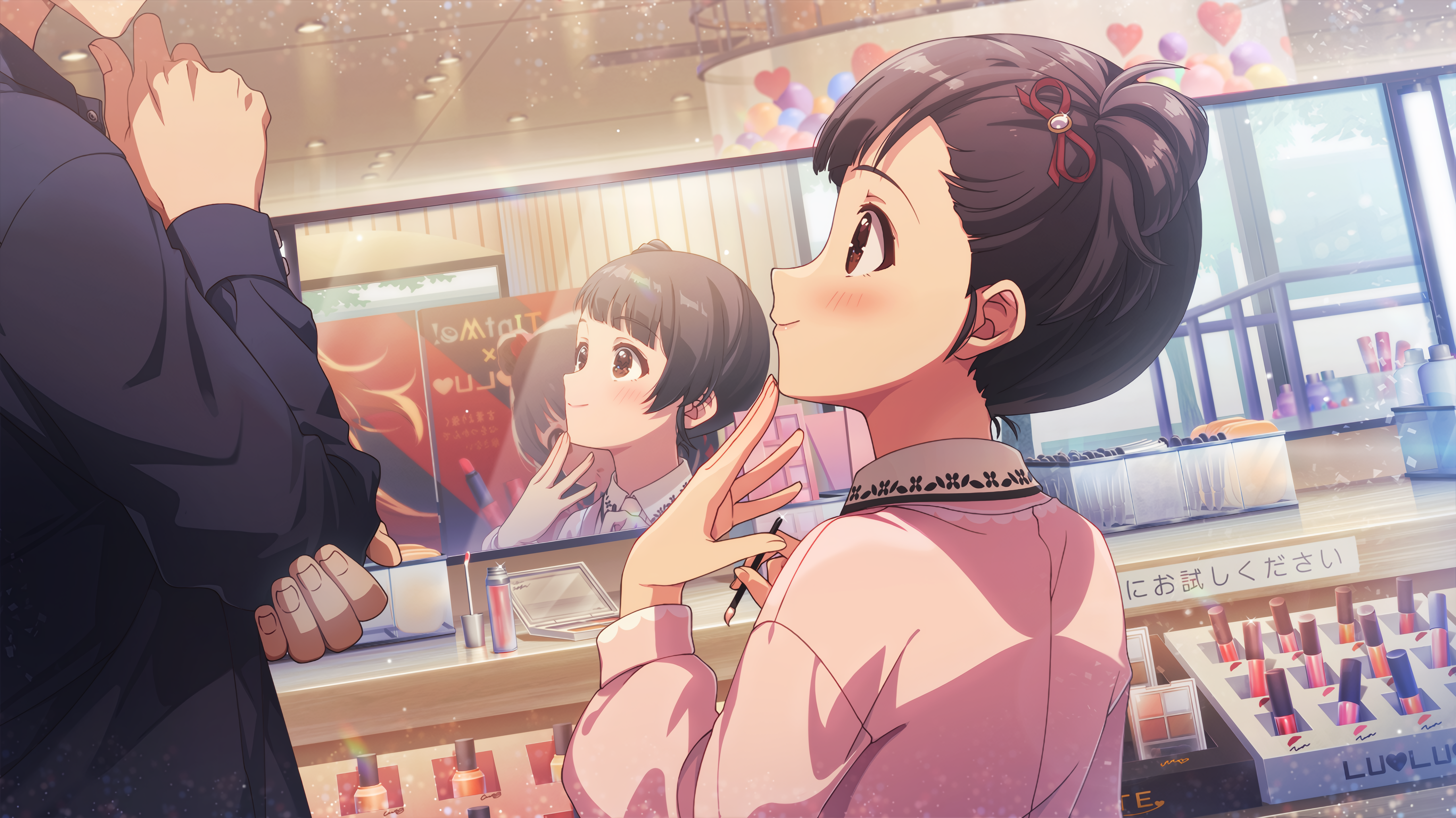 フレーバーテキスト わぁ……お化粧品がこんなにたくさん!あ、見て(プロデューサー名)さん、この色、大人っぽくてキレイだと思わない?こっちのチークもかわいい! えへへ、どれもすっごくステキで、迷っちゃうなぁ。