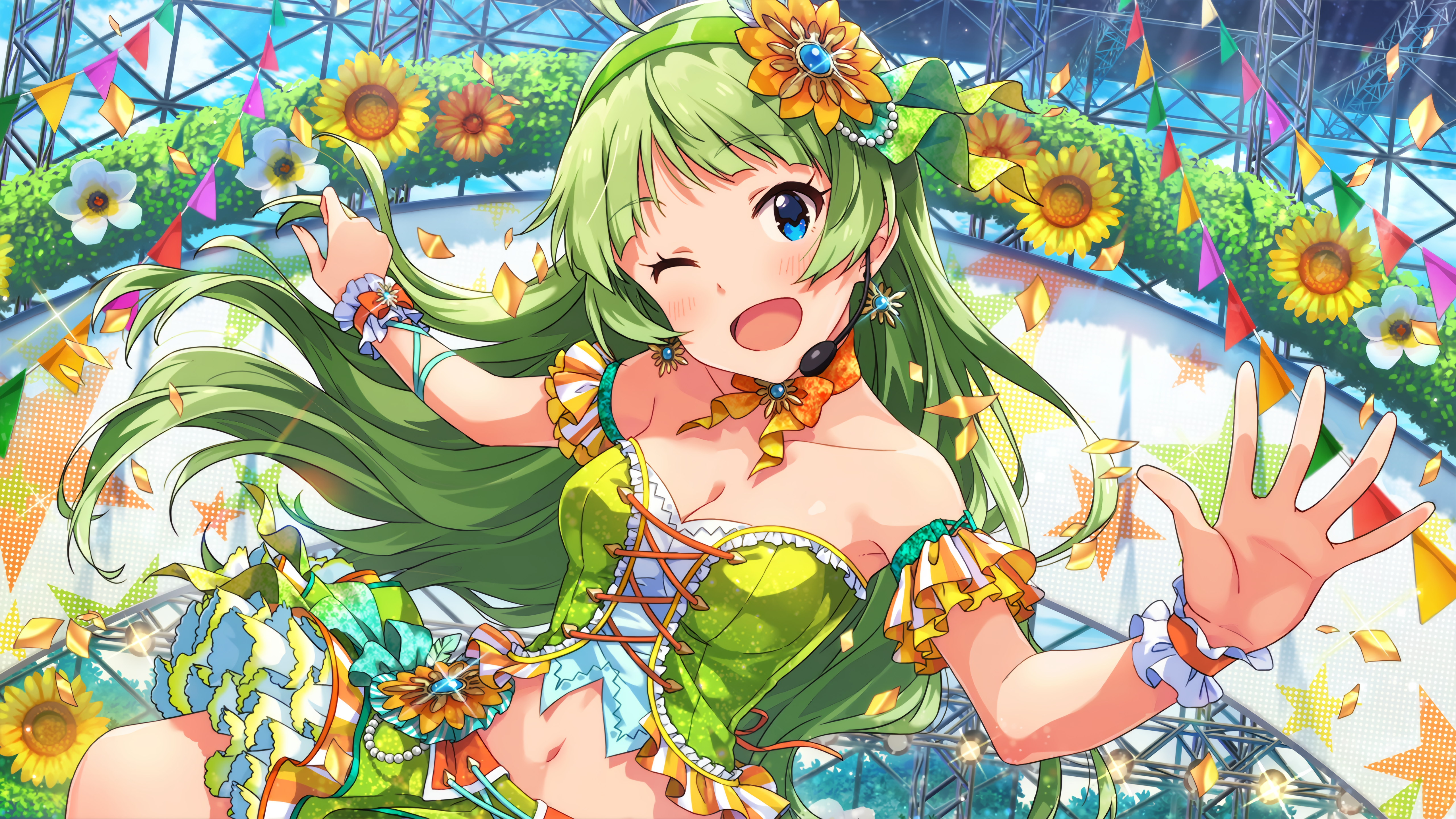 元気いっぱい!トロピカルでキュートな衣装。爽やかな緑のパッションスタイルは、まるでお花畑に咲き誇る太陽のよう!