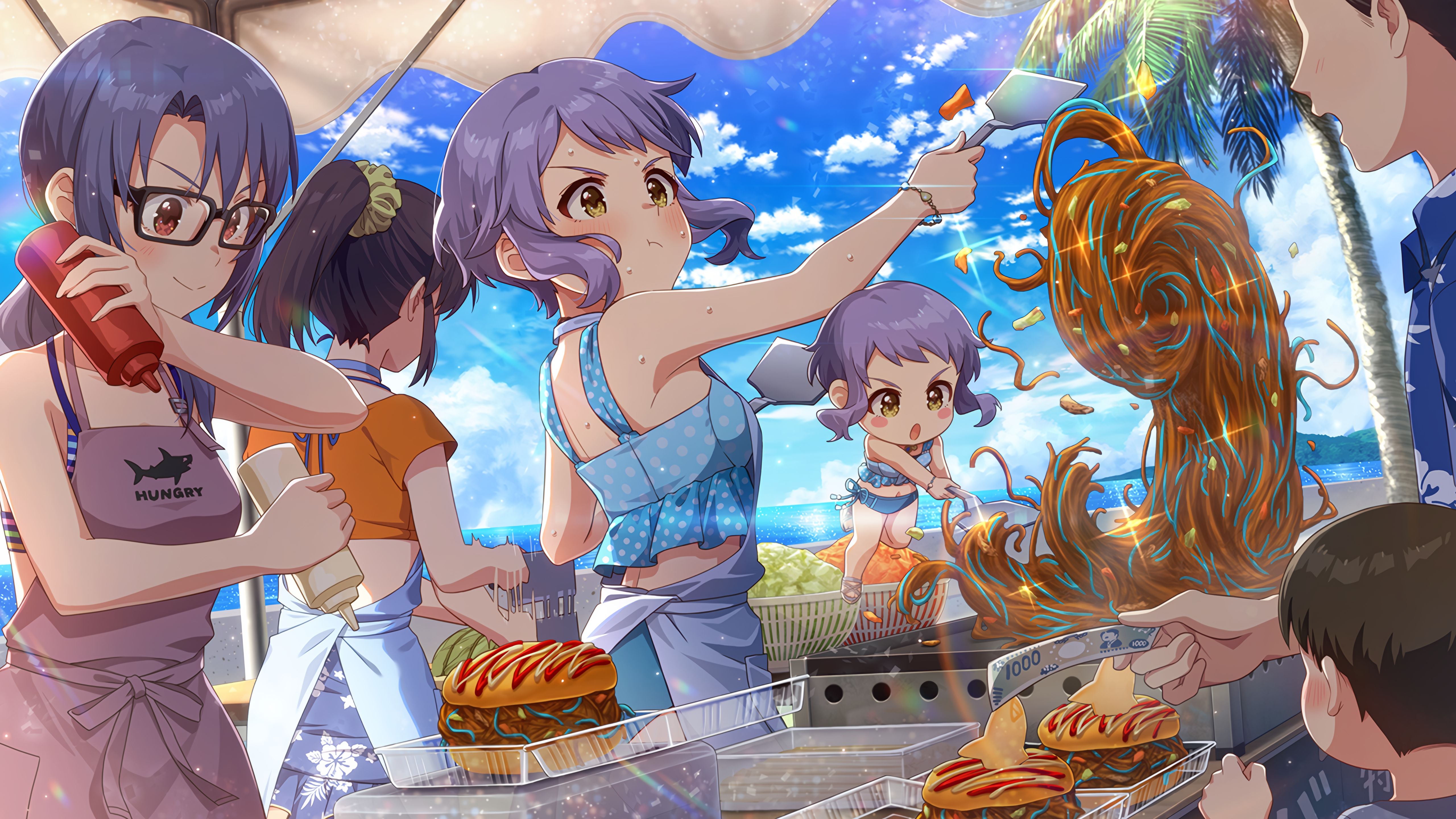 フレーバーテキスト 強い日差しに熱々の鉄板。汗は止まりませんが、海の家は、休む暇もありません。おふたりに負けないように、水着エプロン……いえ、瑞希エプロンの紐をギュッと結んで。……よーし、焼くぞー。