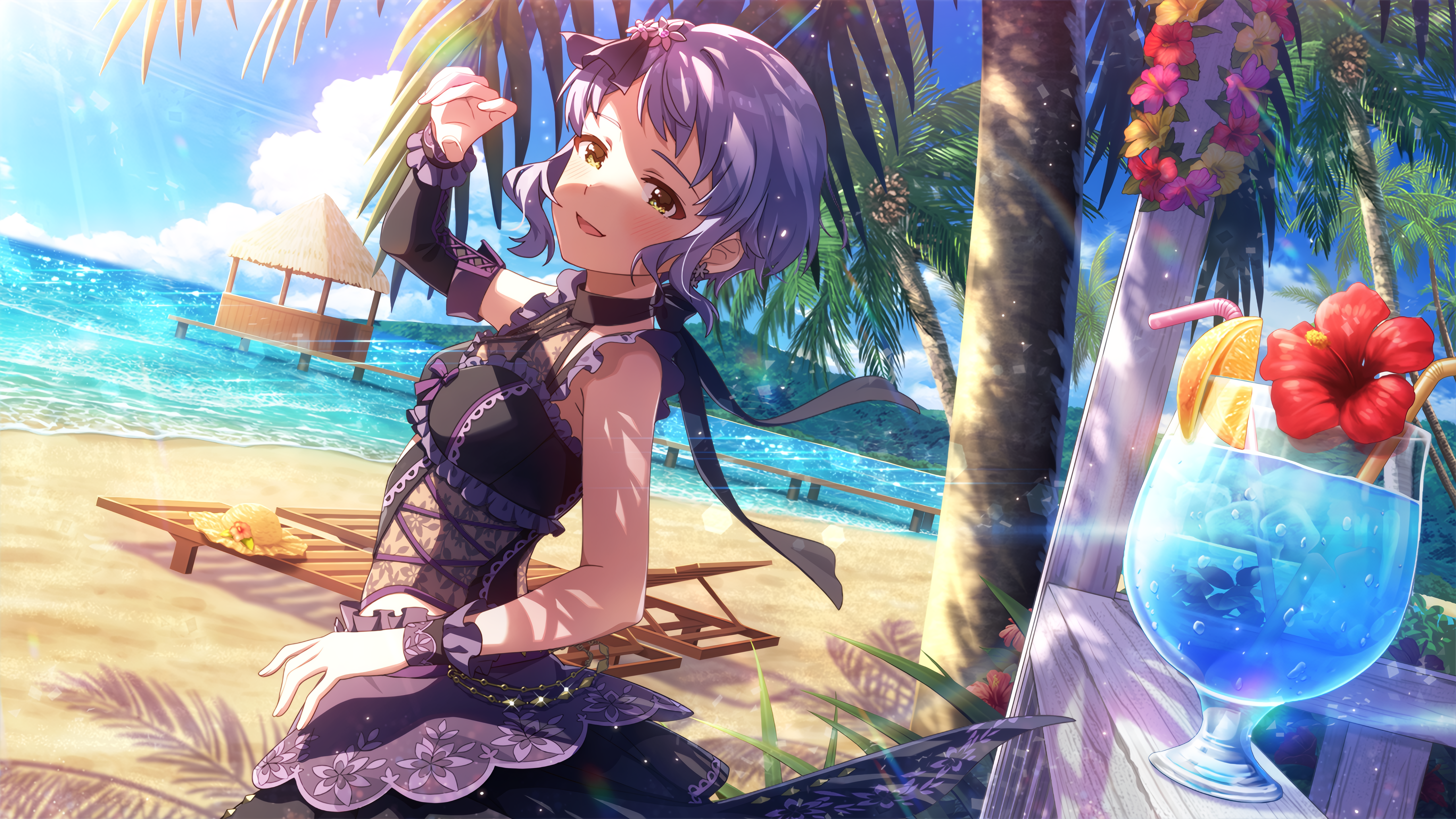 フレーバーテキスト 絶好のグラビア日和ですね。天気も良くて、風も気持ちいいです。このまま海へ飛び込みたくなります……ざぶーん。ふふっ、すみません。あまりに素敵な場所で少し浮かれているようです。