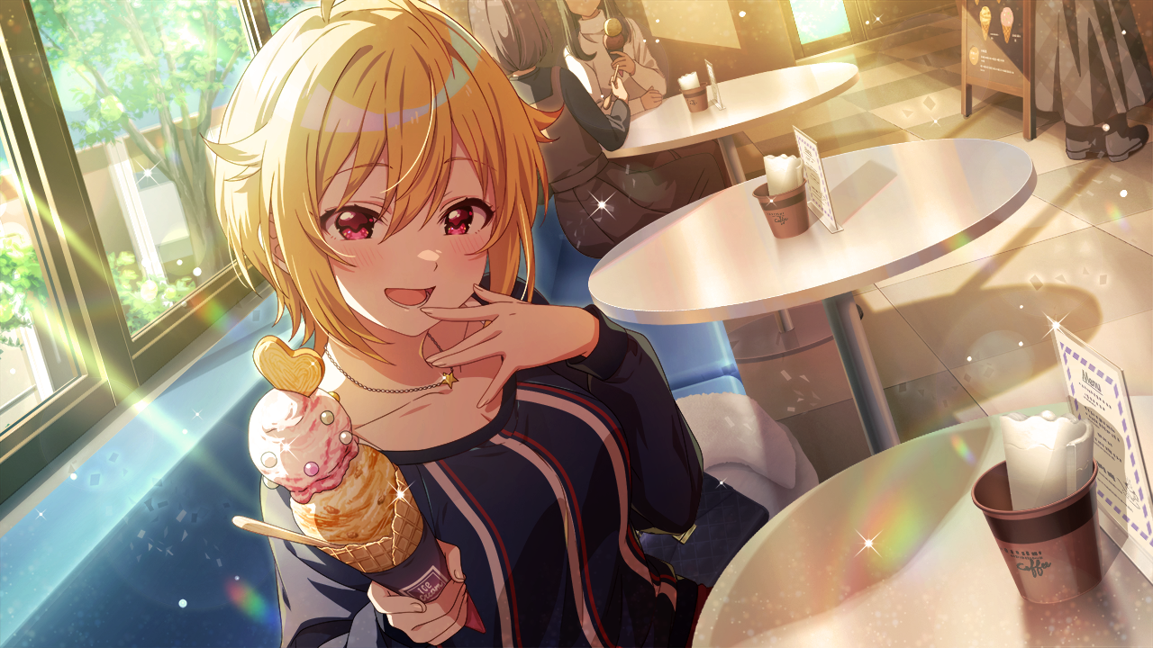 フレーバーテキスト う~ん、おいしい~! やっぱり、季節限定のアイスにして、正解だったかも♪(プロデューサー名)さんも、ひと口……あ、でもやめた方がいいかな。だって……間接キスになっちゃいますもんね、えへへ♪