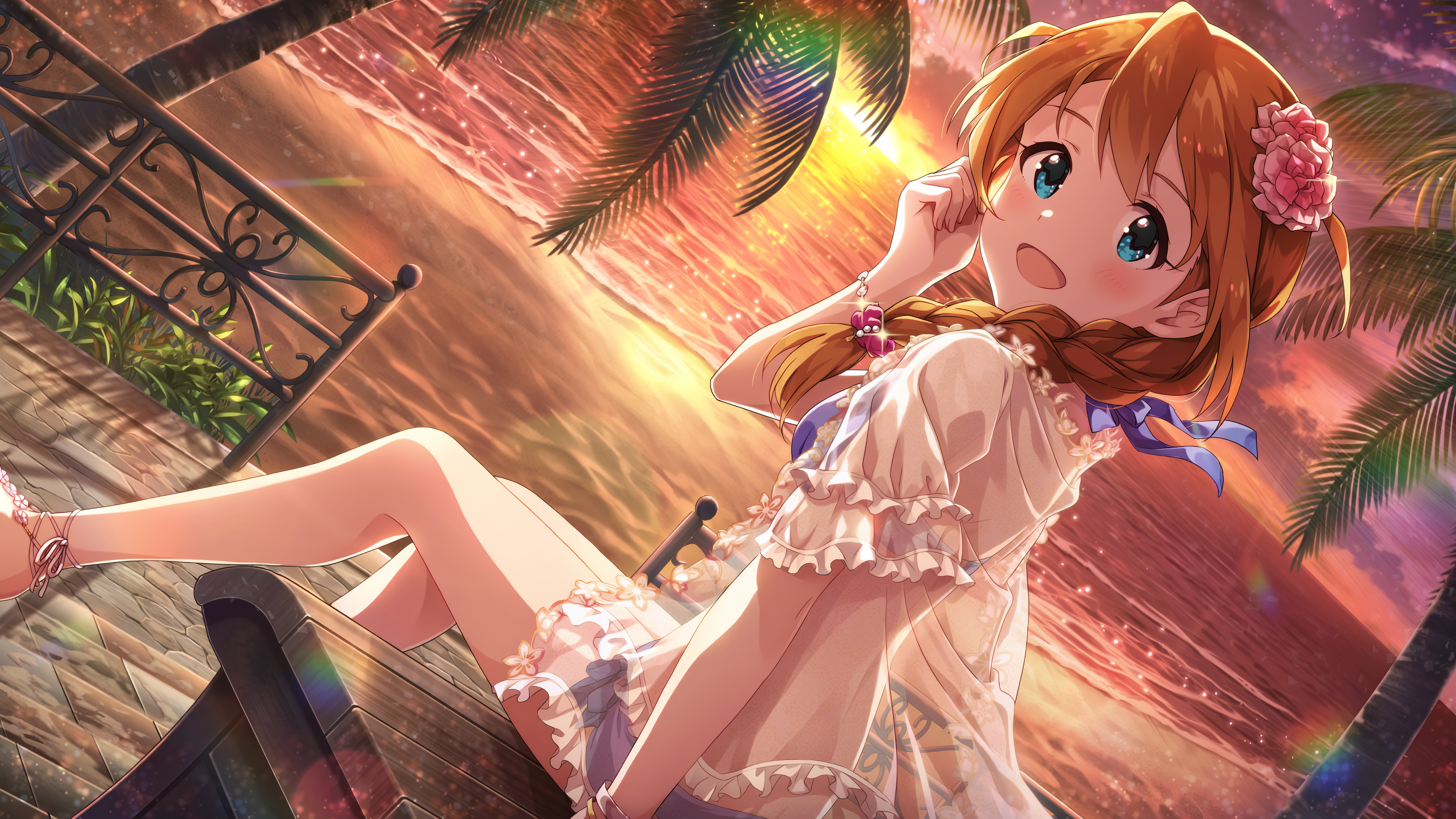 フレーバーテキスト 夕陽に染まる砂浜に、私たち二人っきり……何かが始まりそうなシチュエーションね!あら、(プロデューサー名)……すこし顔が赤いわよ。もしかして、ドキドキしてるのかしら……なんてね、ウフフ♪