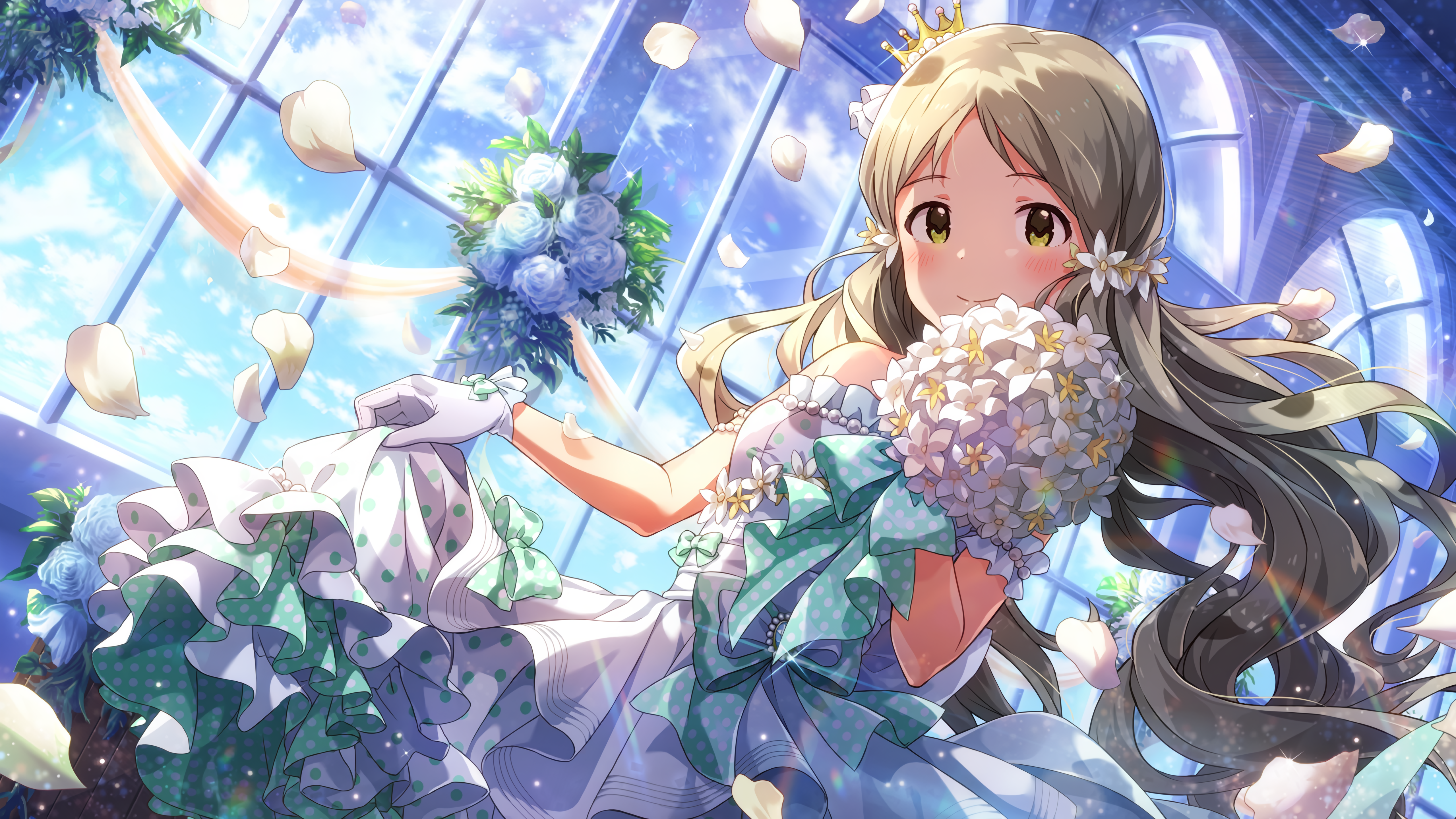チャペルの窓からのぞく白い雲と晴れやかな青空のように爽やかなウェディングドレス風衣装。さあハッピーな明日をクリエイト!