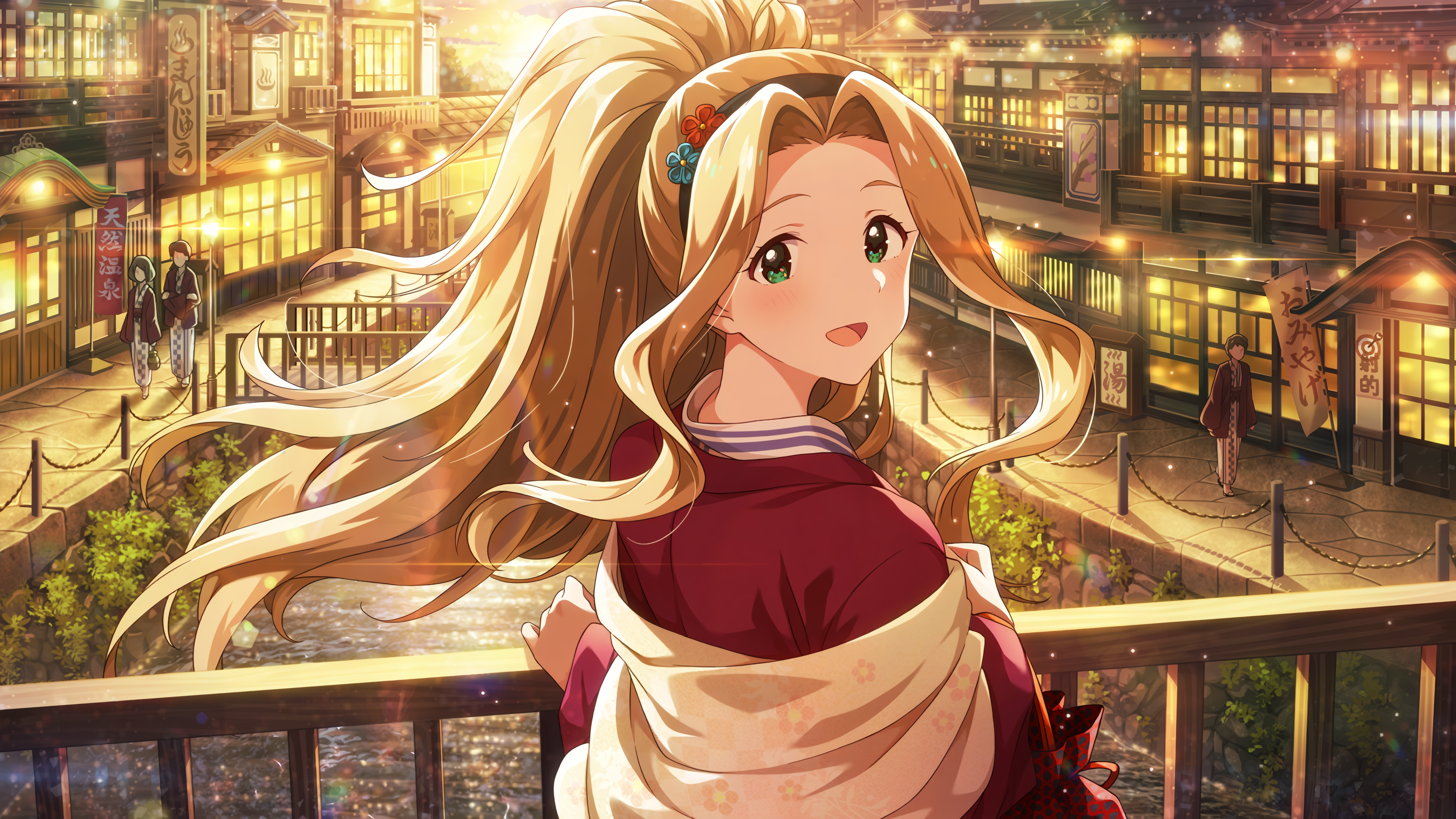 フレーバーテキスト ふふっ、まぶしいくらいの夕焼け……。昔ながらのひなびた温泉街も、案外、悪くありませんわね。貴方とこんなふうにのんびり過ごすのも、たまには悪くない……と、思いますわ……♪