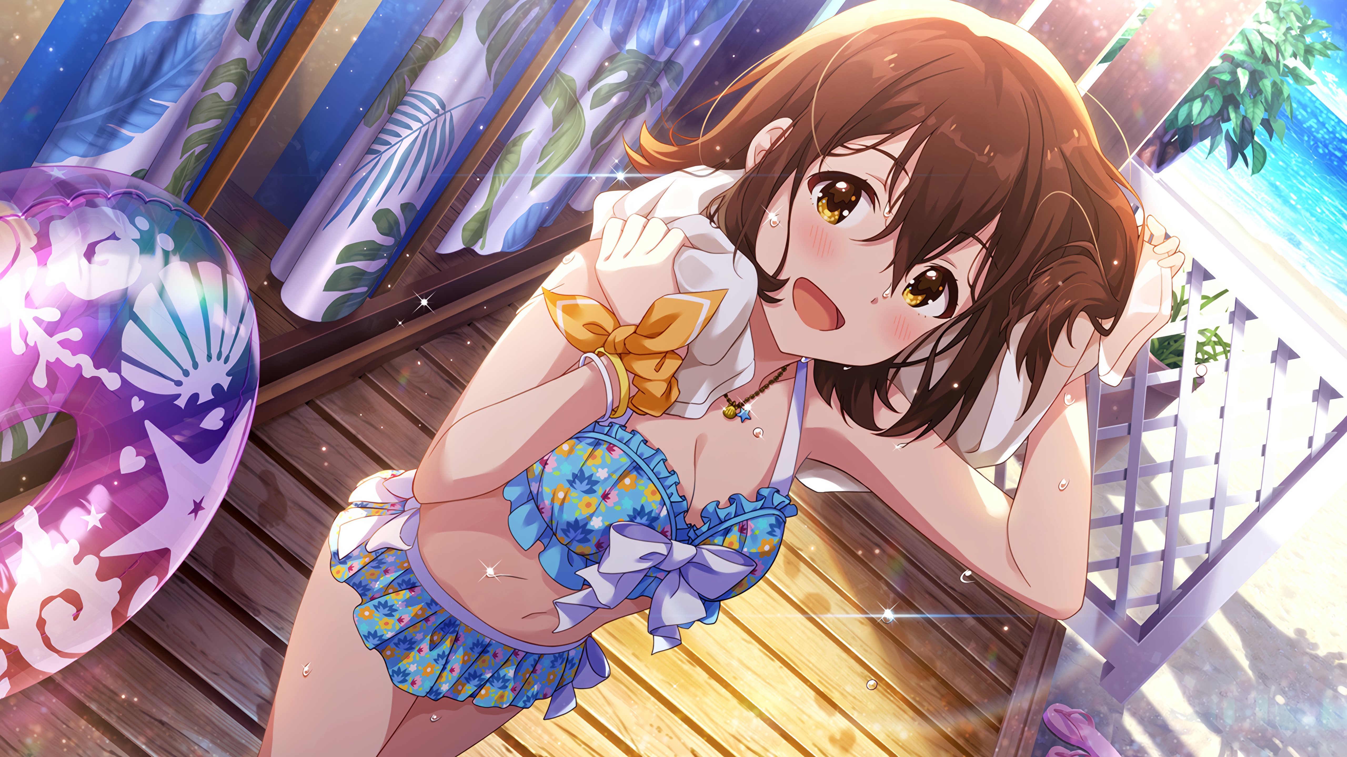 フレーバーテキスト ふぅ~、気持ちよかったぁ♪あ、(プロデューサー名)さんもシャワーですか? じゃあ、私が使ってたとこ、まだ空いてますからどうぞっ!ほら、誰か来ちゃう前に入ってください!